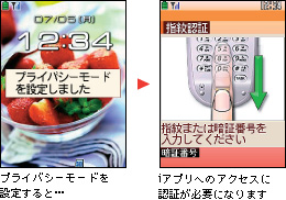 F900iCのプライバシーモードでは、電話帳とメールに加えiアプリにも対応。