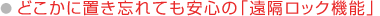 F900iCでは、万一の置き忘れや紛失時に無断使用されないよう、公衆電話などからロックをかけられる遠隔ロック機能を搭載。あらかじめ決めてある発信元から設定してある着信回数を鳴らすことで、各種メニュー機能の操作などをストップさせるオールロック※が作動します。ICカードロック機能も同時に作動するのでICカード内データの閲覧・使用も防ぐことができます。