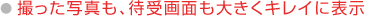 メインディスプレイには262,144色の2.4インチ大型QVGA液晶(全透過)を搭載。撮影した動画や静止画をくっきり鮮やかに映し出します。また、背面ディスプレイには4,096色の1.1インチ有機EL※を採用。美しい発色と明るさで待受画面を楽しめます。