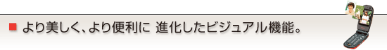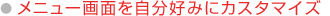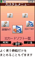 豊富なスクリーンメニューやアイコンを組み合わせることで、好みに合ったメニュー画面を作成できます。また、メール機能を重視したメニュー画面や、iモードFeliCaに関する機能をまとめたメニュー画面など、よく使う機能だけを集めてメニュー画面を作成することも可能。ノーマルメニューに戻したいときは、ワンタッチで切り替えることもできるので便利です。