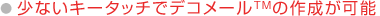 文字の色やサイズに変化をつけたり、お気に入り画像を挿入したり。より表現力豊かなメール交換を楽しめるデコメール。F900iCは、そんなデコメール作成を手軽に行えるような工夫がいっぱい。文字色やサイズ変更のときなどに必要な範囲選択キーをソフトキーに配置したことで、少ないキータッチ作成が可能に。さらに画面上には、デコメール装飾機能をツールバー化。これにより、デコメールの編集・加工を直感的な操作で楽しめます。