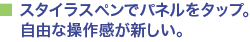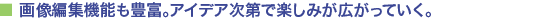 スタンプ画像を作って他の画像に貼りつける。画像に文字を書き込む。手書きイラストを作る。タッチパネル入力を活かした機能が満載。思いのままにペンを走らせて、イメージ作りを楽しめます。