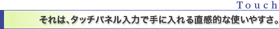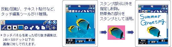 10キーやカーソル入力にはない流れるような操作で、ケータイの楽しみが広がります。たとえば、画像編集。切り抜きなどで必要な、なめらかなライン取りも思いのままに。2.4インチの大画面液晶だからタッチパネルの有効範囲も広々。ディテールにこだわって編集できます。