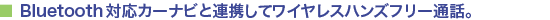 Bluetoothハンズフリーに対応したカーナビなどのシステムを搭載したクルマなら、ワイヤレスでハンズフリー通話が可能。ケータイがバッグなどに入ったままでも自動で接続※されるので、乗車後の操作も不要。着信はカーナビ画面などによって通知されます。