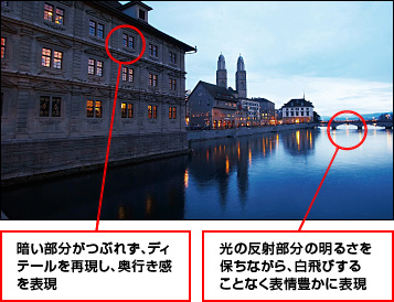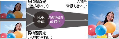 露光時間の違う2枚の写真を同時に撮影し自動合成。実際に目で見る鮮明で美しい風景や、絵画的な写真も楽しめます。