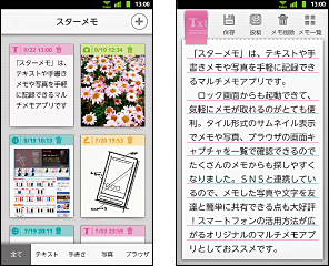 テキストや手書きメモ、写真を手軽に記録できるマルチメモアプリがさらに便利になりました。記録したメモ情報は、au one Friends Note連携で各SNSにすばやく投稿できます。またサムネイル表示で、目的のメモがかんたんに探せます。さらにブラウザの画面メモもページ全体を保存・表示できるようになりました。