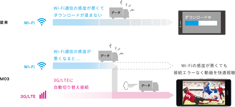 通信状況に応じてWi-Fiから3G/LTE回線に自動で切り替え。安定した通信をキープし、