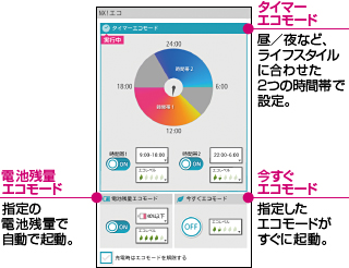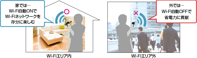 Wi-Fiエリアの外に出たことを、自動で認識。Wi-Fiを自動でOFFにして、切り忘れによる電池の無駄遣いを防止します。