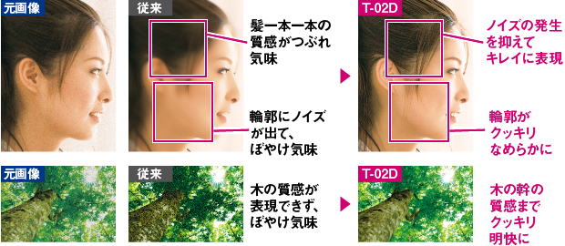 画像上のノイズ量を推定し適切にノイズを抑制します。画像に関係なく一定の強度でノイズを調整する従来型と比べ、格段に美しい映像が楽しめます。