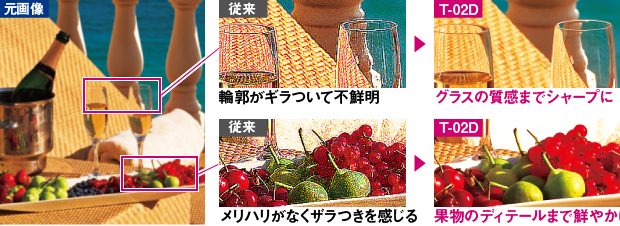 映像に含まれる輪郭や質感を判定し、領域ごとに最適に補正します。画像のボケやギラつき感を低減します。