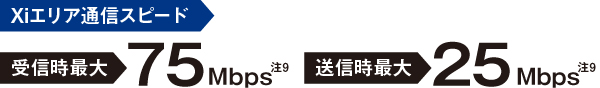 - 注23:受信時最大75Mbps、送信時最大25MbpsはXiエリアの一部に限ります。対応しているエリアの詳細は、ドコモのホームページでご確認ください。通信速度は、送受信時の技術規格上の最大値であり、実際の通信速度を示すものではありません。ベストエフォート方式による提供となり、実際の通信速度は、通信環境やネットワークの混雑状況に応じて変化します。FOMAハイスピードエリア内であっても、場所によっては送受信ともに最大384kbpsの通信となる場合があります。FOMAハイスピードエリア外のFOMAエリアにおいては、送受信ともに最大384kbpsの通信となります。