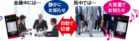 歩行・走行状態や周囲の環境を自動判別。静かな場所では着信音量を小さく、歩行中や騒がしい場所では大きくしてお知らせします。